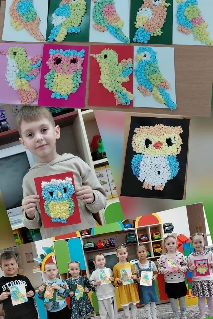 На занятии ребята изготовили аппликации из бумажных салфеток с изображением птиц.